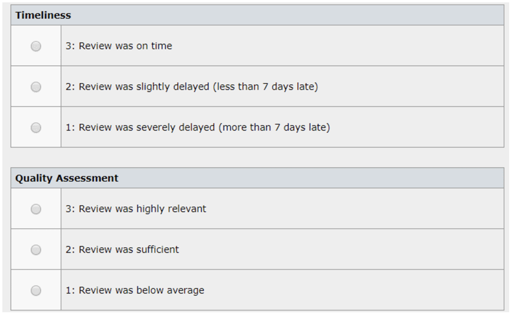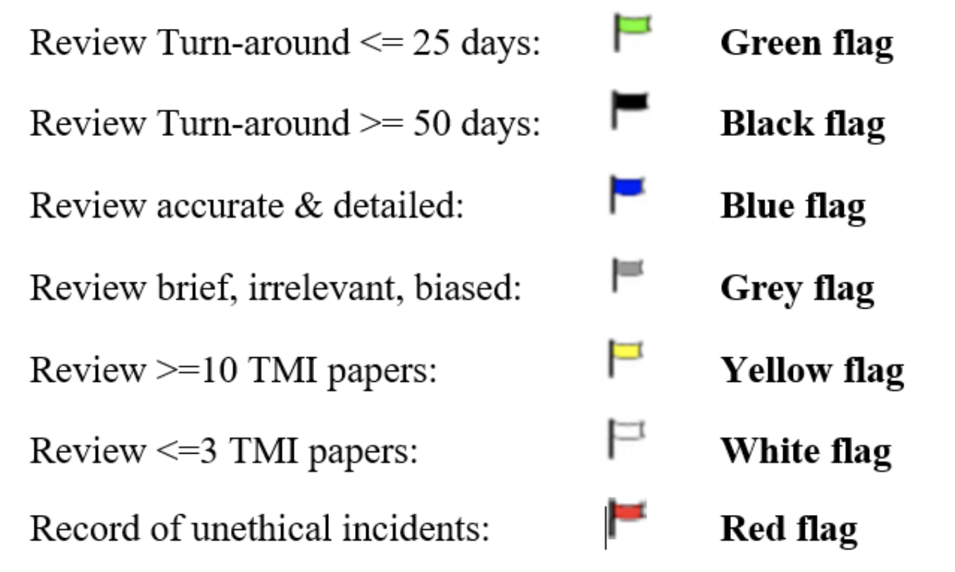 Review quality (being critical), timeliness, and quantity of reviews as a TMI reviewer. -