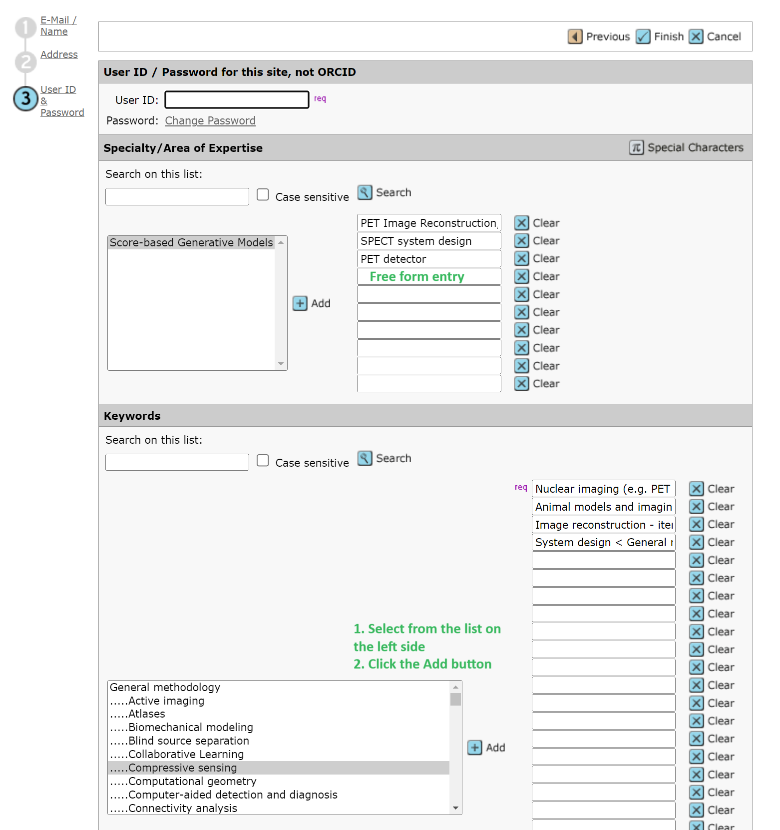 Growing your professional reputation, i.e. publishing and networking, in the medical imaging community would be helpful for you to make to the AE’s private list and/or the recommended list by Reviewer Locator. Defining your keywords (next FAQ below) and areas of expertise accurately will help the AE to find you. It is better to be specific on your areas of expertise such as “MR pulse sequence design” and “noise reduction in CT”, rather than broad terms like “medical image analysis”.